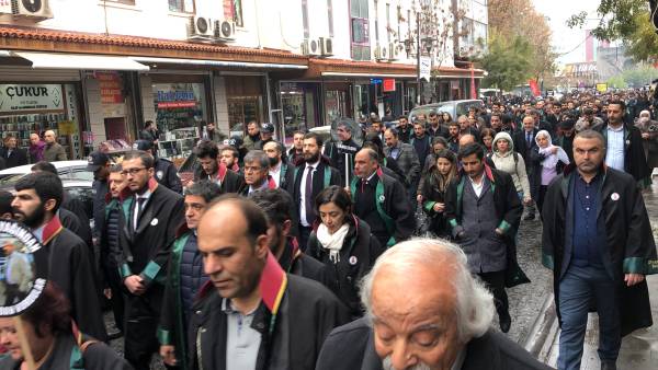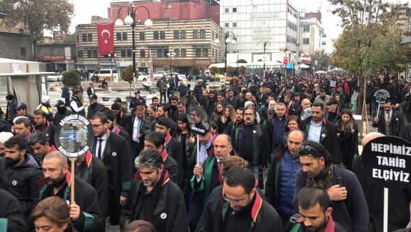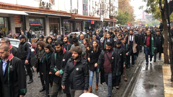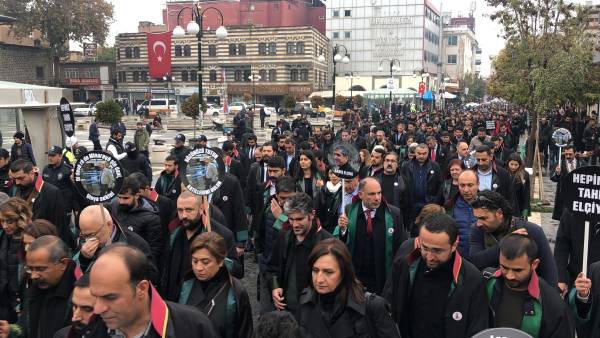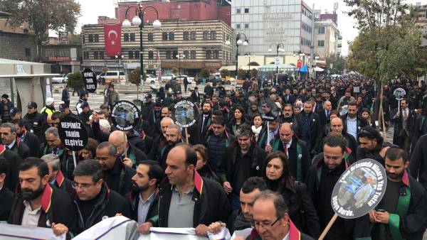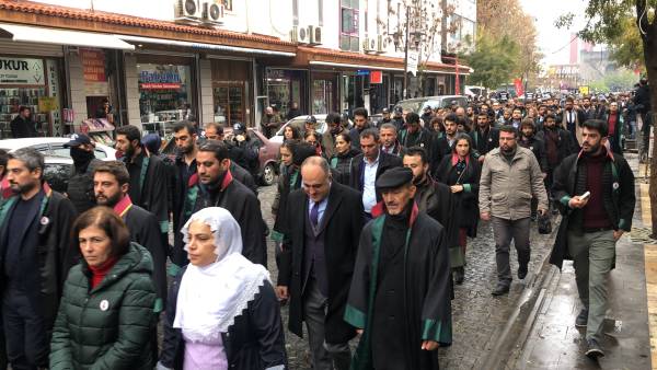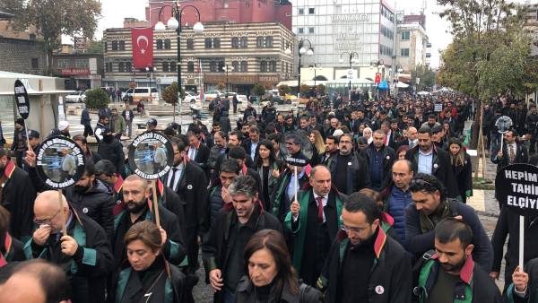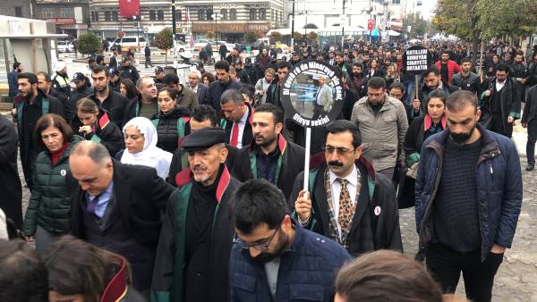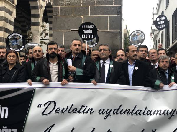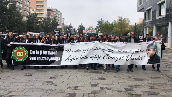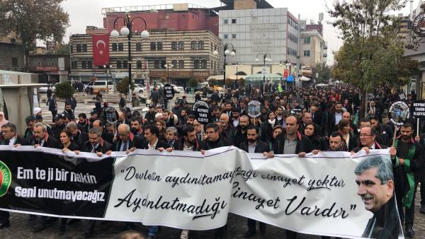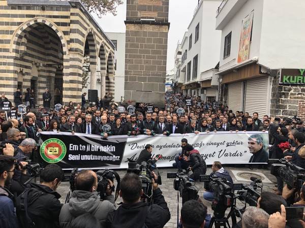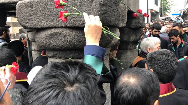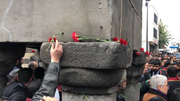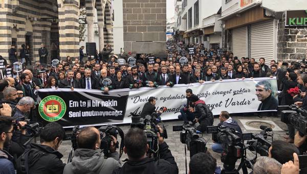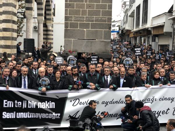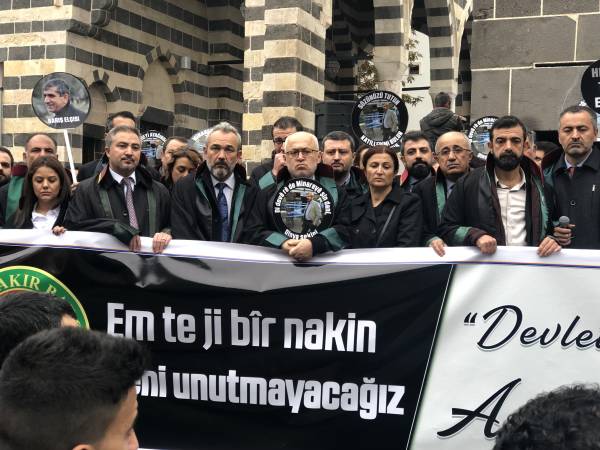 El acto conmemorativo se llevó a cabo frente al Minarete de cuatro pilares en Sur, en homenaje al Presidente del Colegio de Abogados de Amed, Tahir Elci, quien fue asesinado en el minarete por las fuerzas estatales hace 3 años. Grandes grupos de abogados, la viuda de Elci, Turkan Elci, representantes de colegios de abogados y sindicatos de colegios de abogados de Antep, Esmirna y Ankara, así como colegios de abogados turcos (TTB), miembros del Partido Democrático de los Pueblos (HDP) de Amed, los diputados Remziye Tosun, Selcuk Mizrakli y Musa Farisogullari estuvieron presente en el memorial organizado por el Colegio de Abogados de Amed.