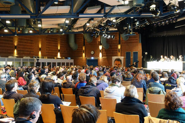 La conferencia continúa hoy con talleres descentralizados. El programa, que se había preparado durante meses, tuvo que ser cambiado debido a la escandalosa cancelación de Audimax por parte de la Universidad de Hamburgo bajo la presión de la Oficina para la Protección de la Constitución. La conferencia continuará el domingo en el Bürgerhaus Wilhelmsburg.