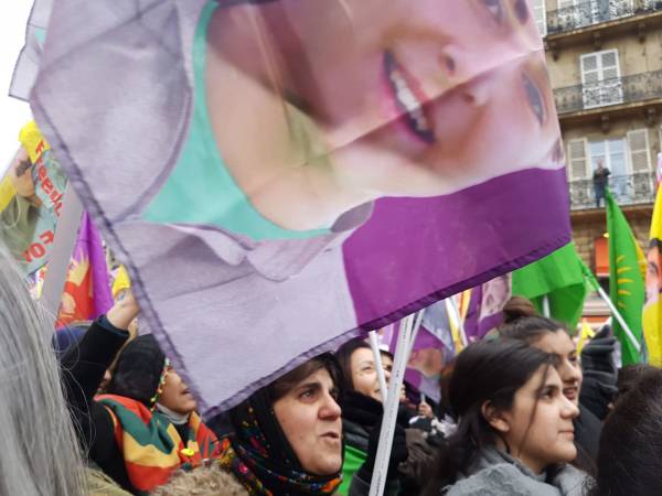 Los manifestantes portan fotografías de la miembro fundadora del PKK, Sakine Cansız, de la que fue representante de la KNK en París, Fidan Doğan, y de quien fue miembro del Movimiento Juvenil, Leyla Şaylemez, y con frecuencia gritan eslóganes protestando contra el Estado de Turquía.