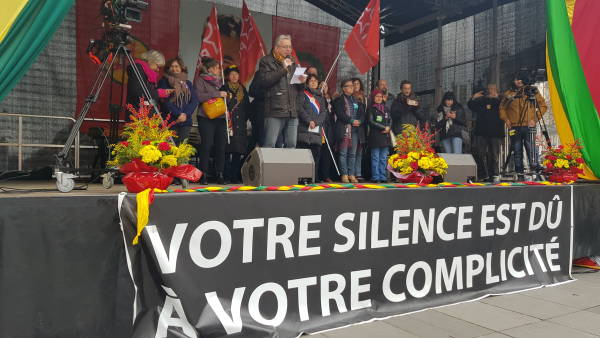 Los manifestantes piden al Estado francés que exponga a quienes ordenaron la masacre y que los lleve ante los tribunales. También mandan mensajes de solidariadad con la huelga de hambre en curso.