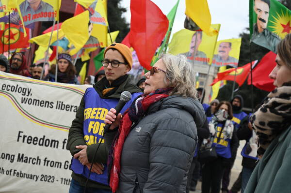 Antes de comenzar, Selma Süren, co-presidenta del Consejo Democrático Kurdo Suizo (CDK-S), dio el pésame por el terremoto en el Kurdistán. Süren declaró: "Nos hemos unido por Öcalan. Lleva 24 años encarcelado. El pueblo europeo, el Comité Europeo para la Prevención de la Tortura (CPT) y la ONU guardan silencio ante el aislamiento de Öcalan. Internacionalistas de todo el mundo están entre nosotros y nosotras.Este apoyo nos da fuerza. Lamentamos el terremoto, pero continuaremos nuestra marcha".