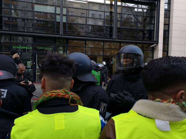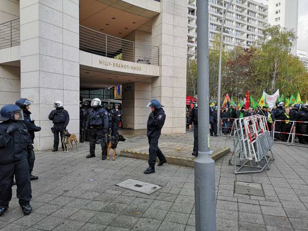 Hubo protestas particularmente ruidosas frente a la sede del SPD, que fue rodeada masivamente con perros y unidades especiales. Se hizo referencia al papel del Ministro de Asuntos Exteriores Heiko Maas, que evitó las sanciones contra Turquía a nivel de la UE y que acababa de regresar de una visita amistosa a Ankara. La protesta terminó con una gran manifestación en Potsdamer Platz.