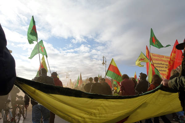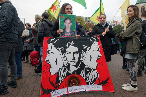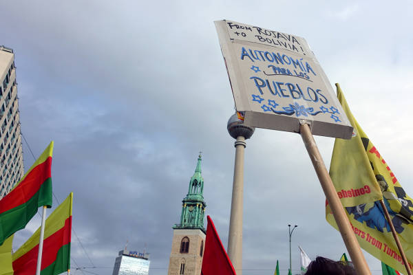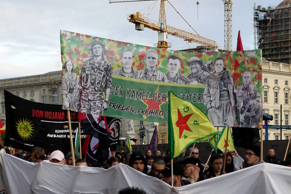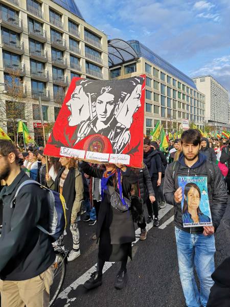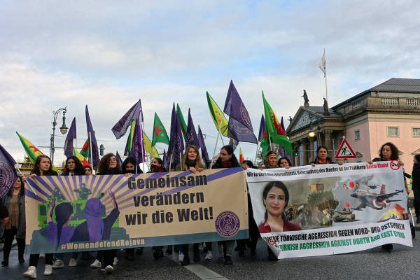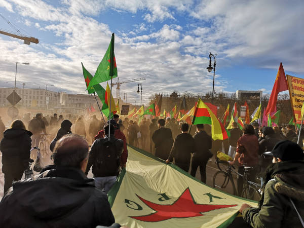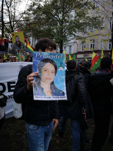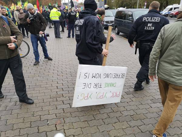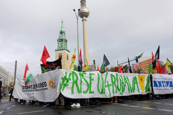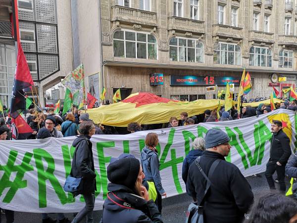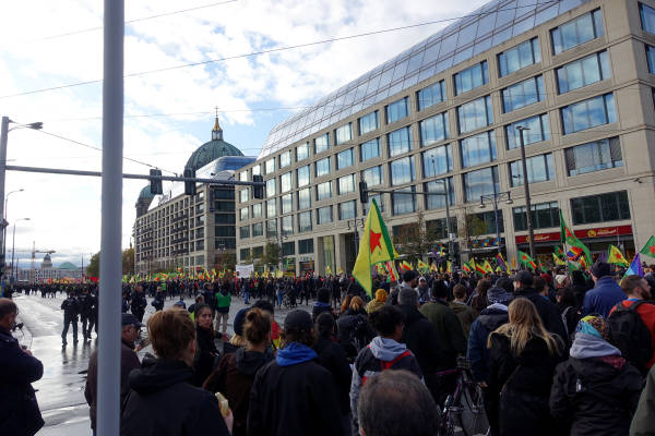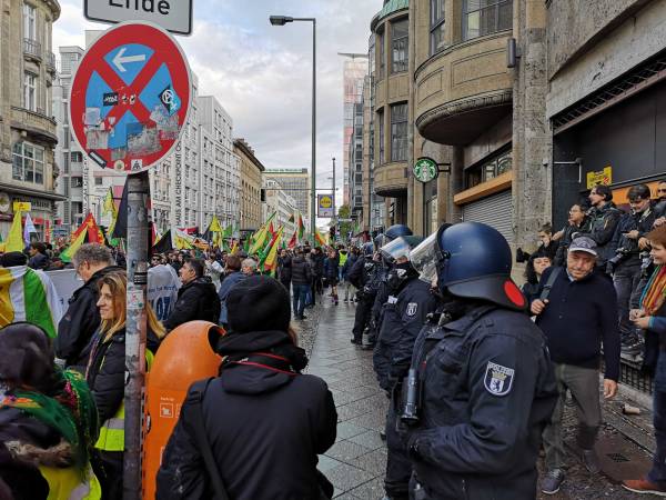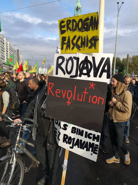 La marcha de protesta fue acompañada por numerosas banderas de organizaciones kurdas, antifascistas y de izquierda. Una tanque de cartón con una muñeco que representaba al presidente turco Recep Tayyip Erdoğan hacía referencia a las exportaciones de armas alemanas al régimen de Ankara. Los manifestantes no se dejaron provocar ni intimidar por el contingente masivo de policías enmascarados y con casco y enviaron una poderosa señal de solidaridad. Tanto los participantes en la marcha como los oradores mostraron toda la amplitud de la resistencia: desde las asociaciones kurdas y las organizaciones yezidi, hasta el movimiento de mujeres, las Mujeres Defienden Rojava, la Izquierda Radical de Berlín, la Izquierda Intervencionista, Fridays For Future y el movimiento de la sociedad civil Seebrücke, muchos oradores expresaron su solidaridad con Rojava y su determinación de resistir la invasión. Se hizo un llamado a tomar medidas contra las corporaciones que producen armas para el régimen de Erdoğan