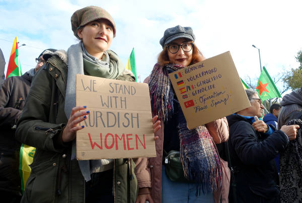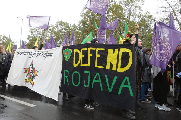 La multitud se reunió a mediodía en la Alexanderplatz antes de que comenzara la manifestación masiva, encabezada por un bloque de mujeres y seguida por internacionalistas, activistas del clima y muchas otras personas que querían expresar su ira y protestar contra la guerra de agresión turca.