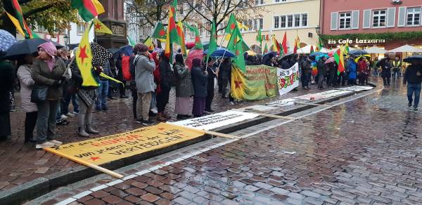 Kurdos y simpatizantes alemanes se concentraron en la plaza Soleo de Heilbronn para protestar contra los ataques genocidas llevados a cabo por el Estado turco y sus aliados mercenarios.