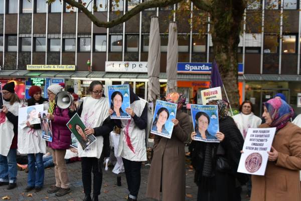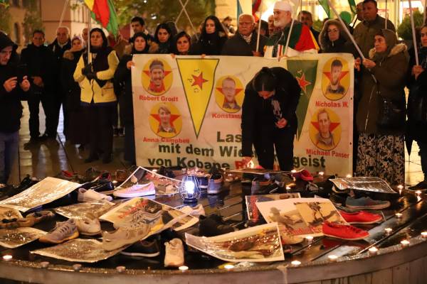 Las activistas llevaron fotos de las mujeres que perdieron la vida durante los ataques de invasión llevados a cabo por Turquía, Fatma, Amara Renas, Hewrin Xelef, Zin Qobanê, Sevrinaz, Sara, Sozdar Muhammad y de Muhammad Hamit, un niño cuyo cuerpo fue quemado con las bombas de fósforo utilizadas por Turquía. Los activistas leyeron la historia de su vida y su lucha.