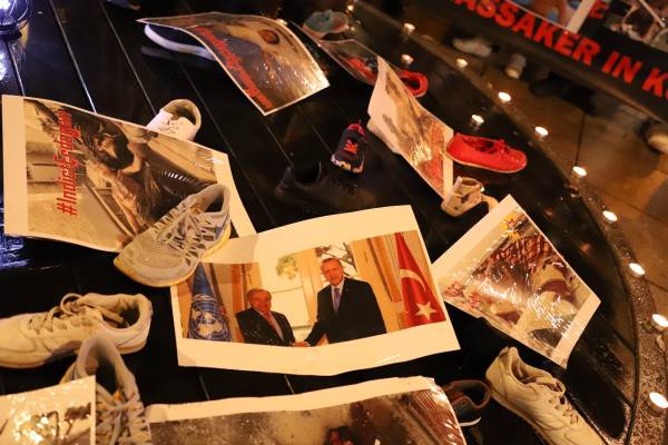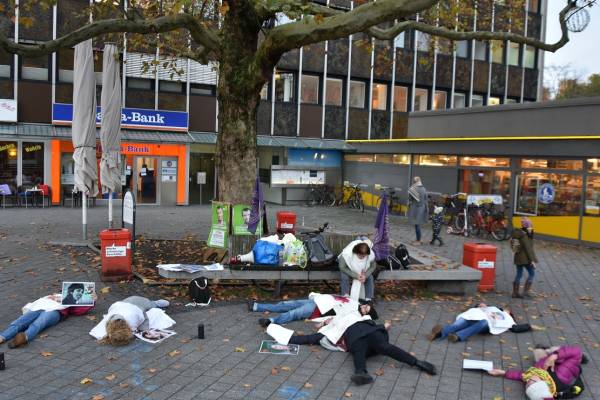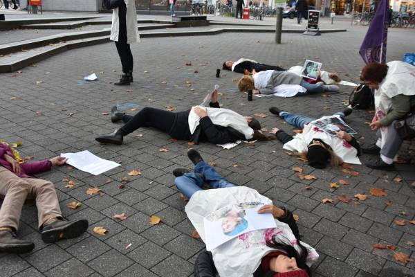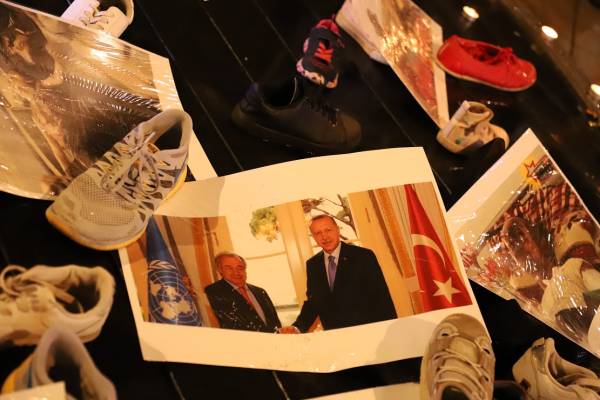 Activistas encendieron velas para conmemorar a quienes perdieron la vida en los ataques. Turquía fue condenada por el uso de armas químicas y la continua masacre de civiles. Para protestar por el silencio de los países europeos, los activistas pusieron los zapatos en una línea, para representar a aquellos que perdieron la vida con armas europeas.