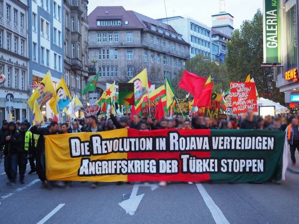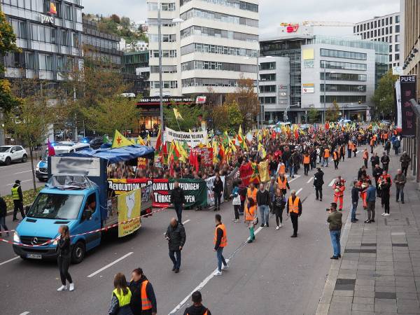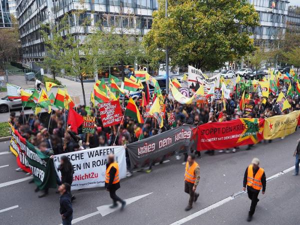 Hoy se ha celebrado una manifestación en la ciudad alemana de Stuttgart como parte de la campaña mundial #RiseUp4Rojava. Alrededor de 12.000 personas protestaron contra la guerra de invasión turca y expresaron su apoyo al proyecto progresista de Rojava.