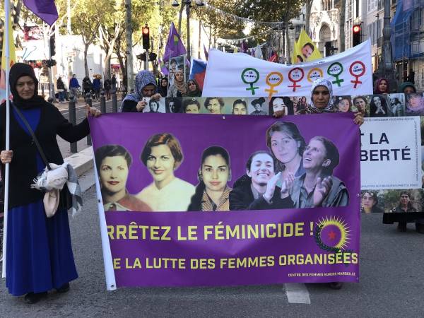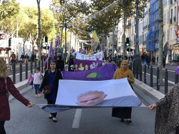 En Marsella, activistas de la manifestación del 25 de noviembre llevaron fotografías del líder popular kurdo Abdullah Öcalan y de las tres revolucionarias kurdas asesinadas en París en enero de 2013.