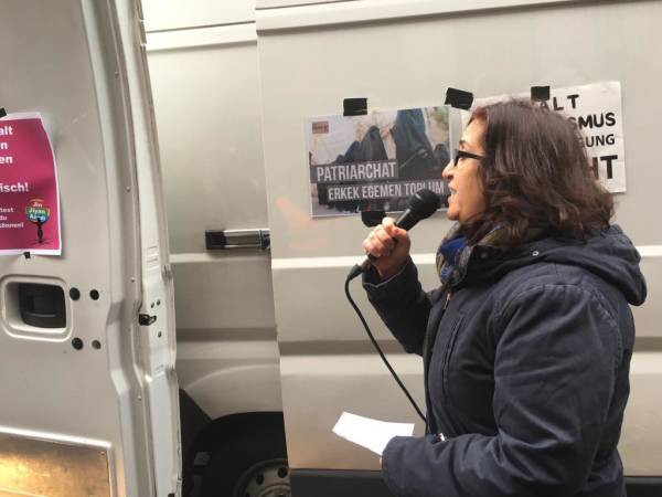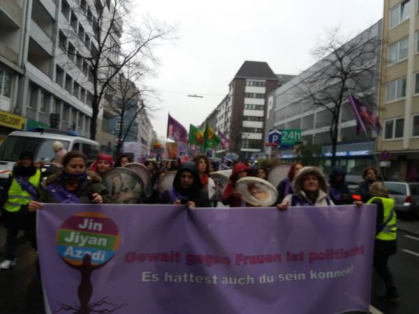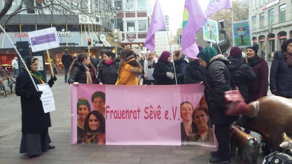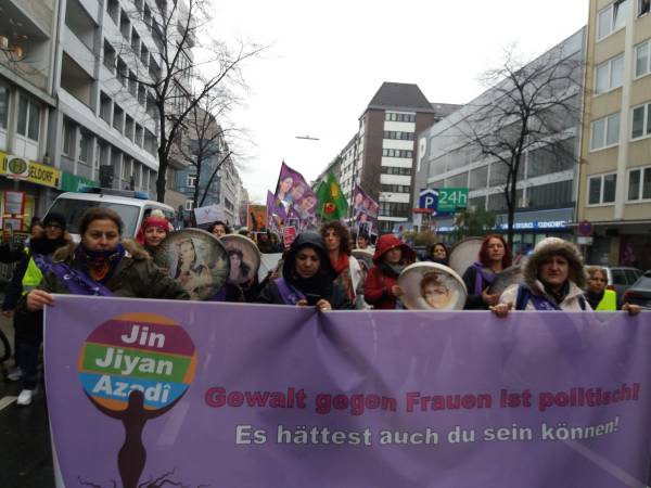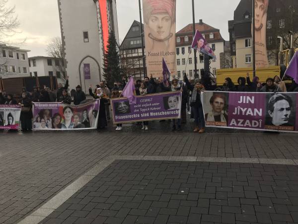 Hablando en nombre de YJK-E Frankfurt, Vildan Dirik dijo que la mentalidad dominada por los hombres sigue aumentando su violencia contra las mujeres todos los días. Al señalar la importancia de la organización para detener la violencia contra las mujeres, Dirik dijo: "No hay posibilidad de violencia, esclavitud y explotación laboral donde hay mujeres libres".