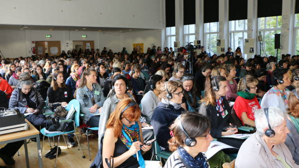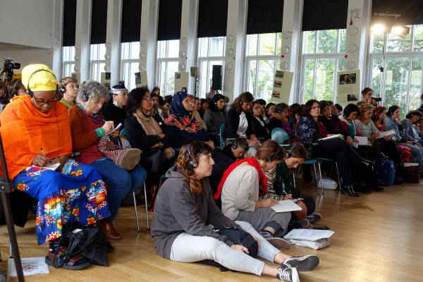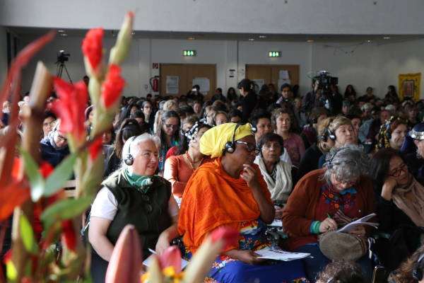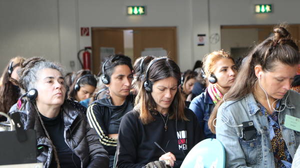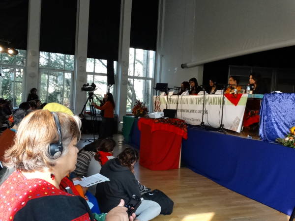 La segunda sesión se tituló "Diferentes localidades, luchas universales: experiencias de movimientos de mujeres" y contó con la participación de seis mujeres de diferentes países que relataron su experiencia de resistir y organizarse en diferentes contextos y espacios.