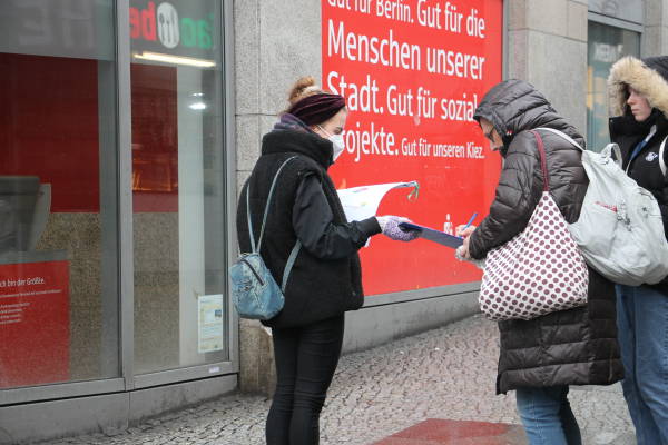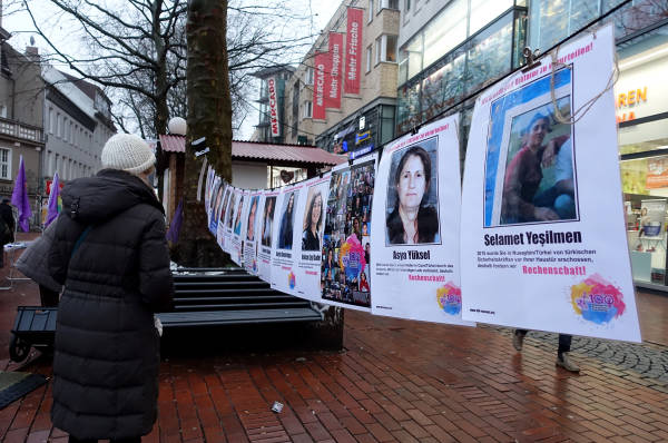 En la Frankfurter Allee de Berlín, mujeres internacionalistas estuvieron recolectando firmas para la campaña. Allí, las mujeres declararon: “Durante los 18 años que lleva en el poder Erdogan, el Estado turco bajo el Partido de la Justicia y el Desarrollo (AKP) ha cometido miles de crímenes con total impunidad. Las mujeres han sido a menudo el blanco de este gobierno, que por un lado normaliza los feminicidios en la sociedad con su mentalidad y sus políticas sexistas, y por otro lado ataca a las diputadas con violencia y prisión. A pesar de existir un gran número de pruebas, estos ataques no han sido procesados. Esta campaña quiere que el principal responsable de estos crímenes rinda cuentas. Además, la campaña pretende llamar la atención de la opinión pública sobre las políticas misóginas del AKP/MHP y evitar de esta manera más asesinatos y crímenes contra las mujeres. En términos generales, la campaña se sitúa en el marco de una lucha mundial contra los feminicidios. La primera fase de la campaña consiste en recoger 100.000 firmas antes del Día Internacional de la Lucha de las Mujeres, el 8 de marzo”.