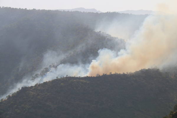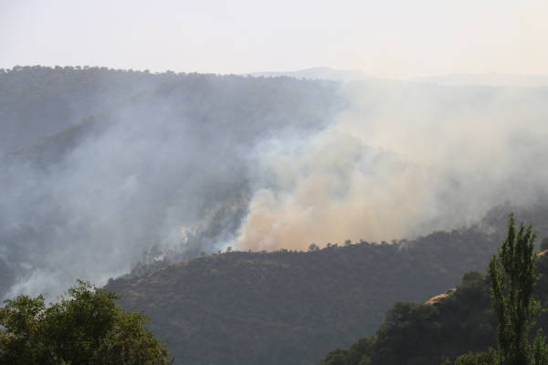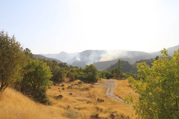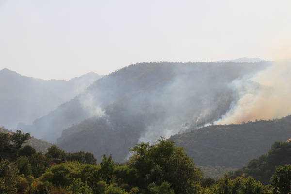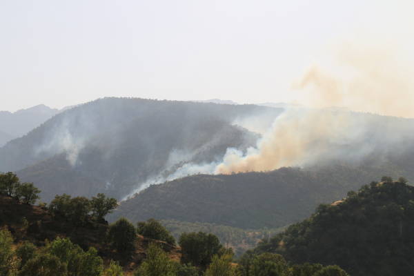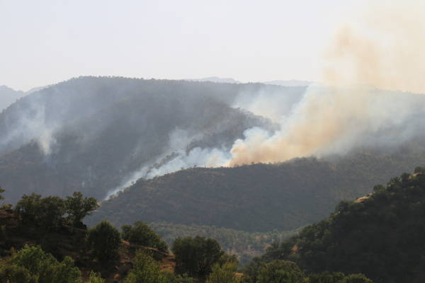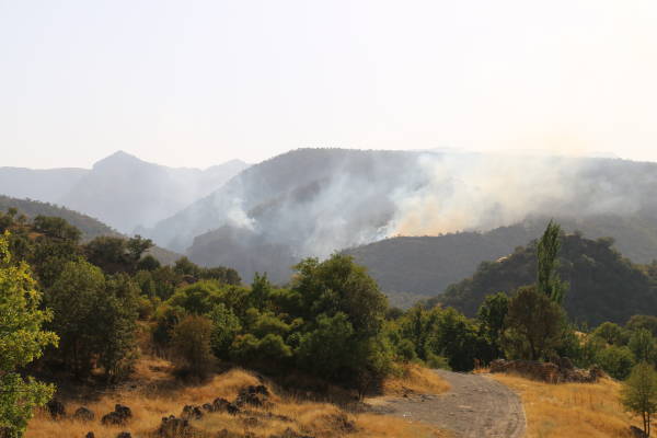 El fuego iniciado por el ataque aéreo turco continúa desde hace dos días y está creciendo más. El incendio ya ha reducido a cenizas grandes extensiones de viñedos y huertos de la población local.