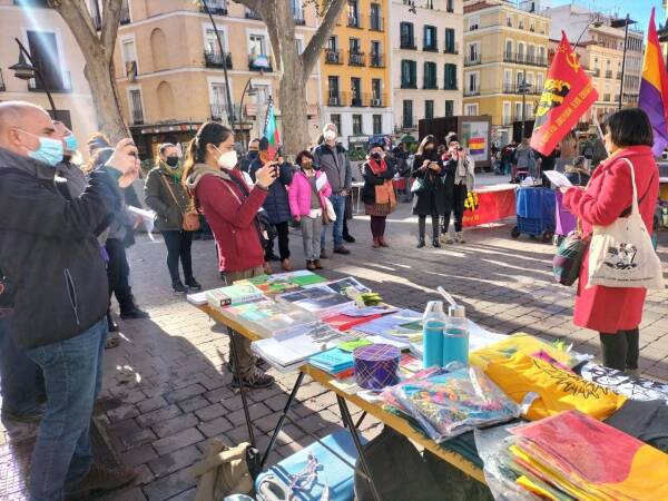 Grupos en apoyo al pueblo kurdo convocaron una concentración en la Plaza Tirso de Molina, Madrid, la mañana del domingo.