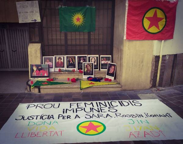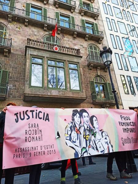 Bajo el lema 'Justicia para Sara, Rojbin, Ronahî: basta de feminicidios impunes', participaron un centenar de compañeras que caminaron en manifestación por el Paseo de Gracia hasta el consulado turco de la ciudad de Barcelona, donde leyeron un texto denunciando tanto los asesinatos en París hace 9 años, como los ataques recientes con drones a varias compañeras del movimiento en Rojava.