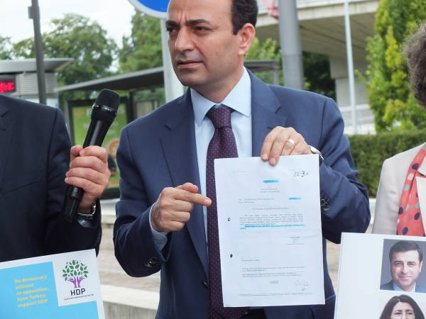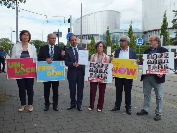 El Portavoz del Partido Democrático Popular (HDP) Osman Baydemir, Vicepresidente del Grupo, Filiz Kerestecioglu y diputados Ertuğrul Kürkçü, Meral Danış Beştaşve Mithat Sancar hirieron una declaración ante el Tribunal Europeo de Derechos Humanos (CEDH) ayer.