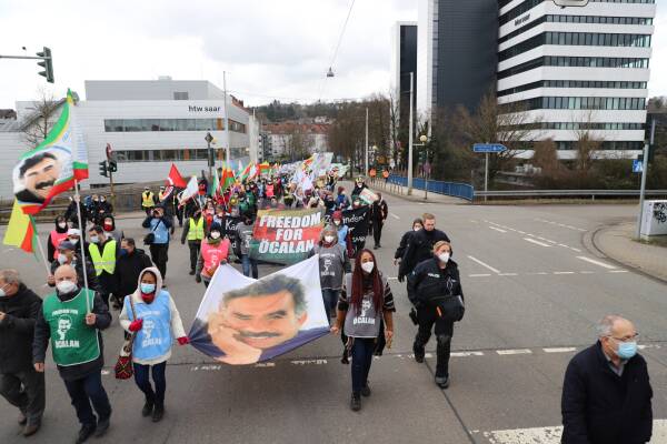 Después de repetidas obstrucciones durante los dos primeros días de la marcha, debido al gran cartel del líder del pueblo kurdo Abdullah Öcalan, esta vez las y los manifestantes fueron bloqueados por la policía estatal de Saarland. La policía prohibió el uso del cartel de Abdullah Öcalan.