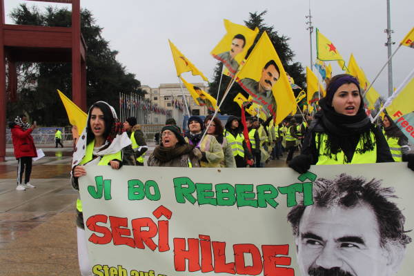 En el cuarto día de la marcha, los activistas llegaron a Ginebra, donde se reunieron frente a la sede de las Naciones Unidas en el 19 ° aniversario de la conspiración internacional contra Abdullah Öcalan.