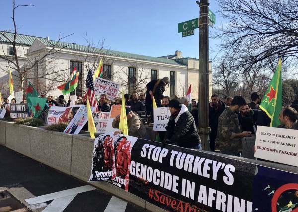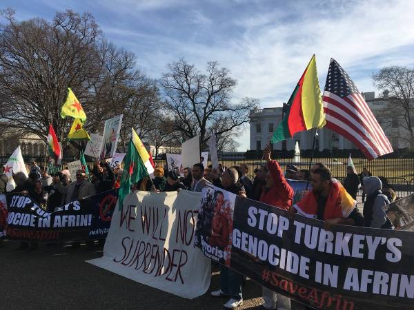 Los manifestantes corearon "¡Turquía fuera de Afrin!" y "¿Quién derrotó a ISIS? ¡YPG, YPJ!", Con pancartas que equiparan a Erdogan con ISIS y hacen un llamamiento para que el mundo pare los ataques. Asistieron casi 300 personas, convirtiéndose en la protesta más grande en solidaridad con Rojava que jamás haya tenido lugar en los Estados Unidos.