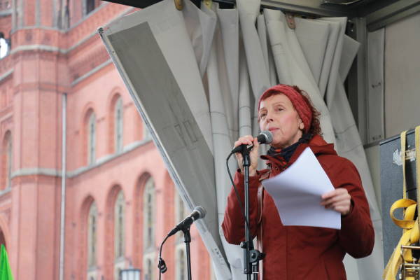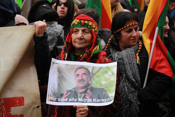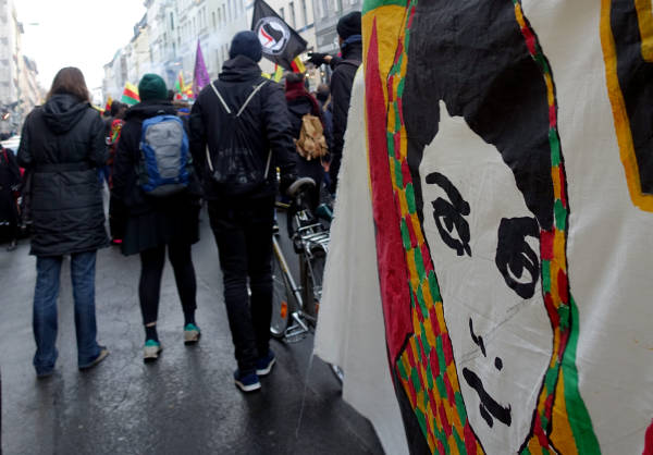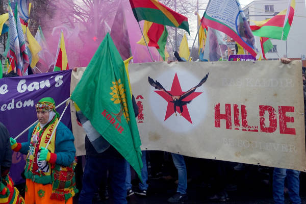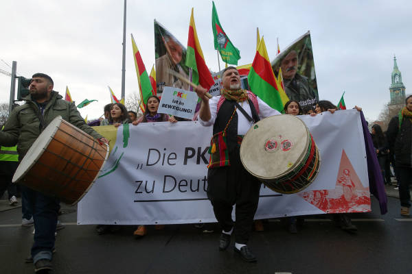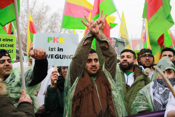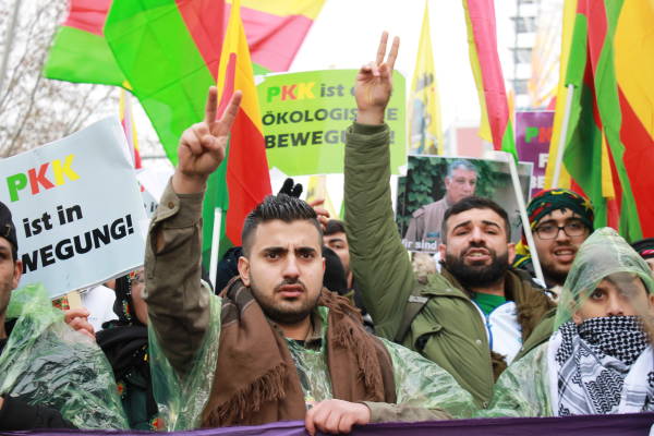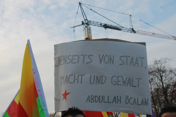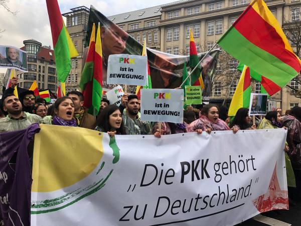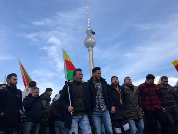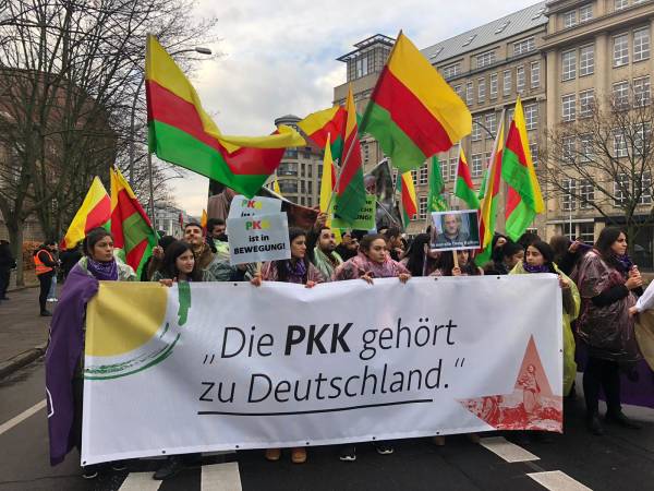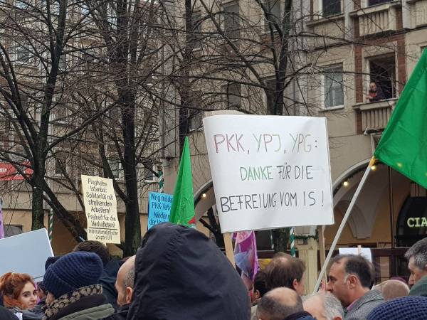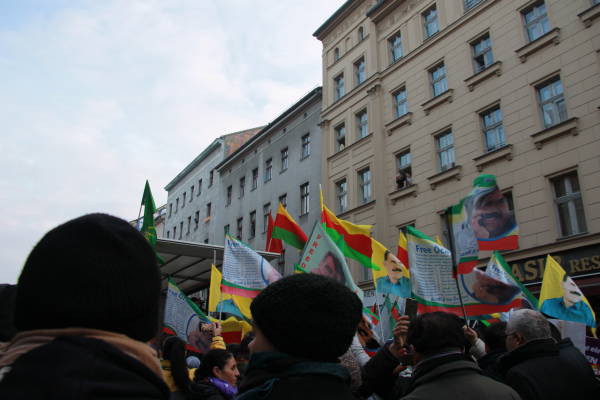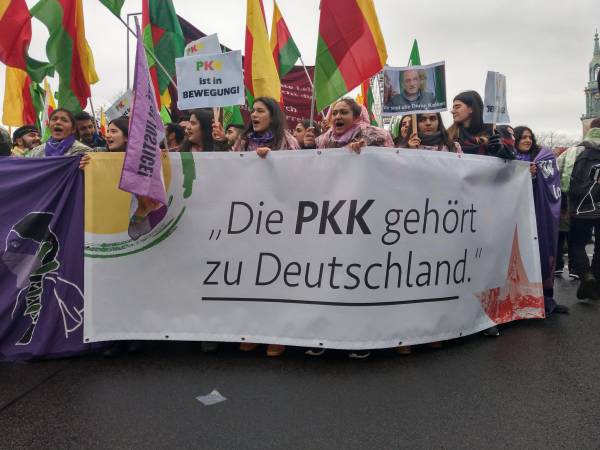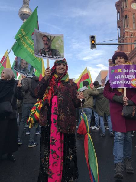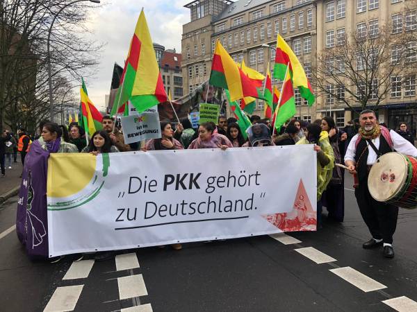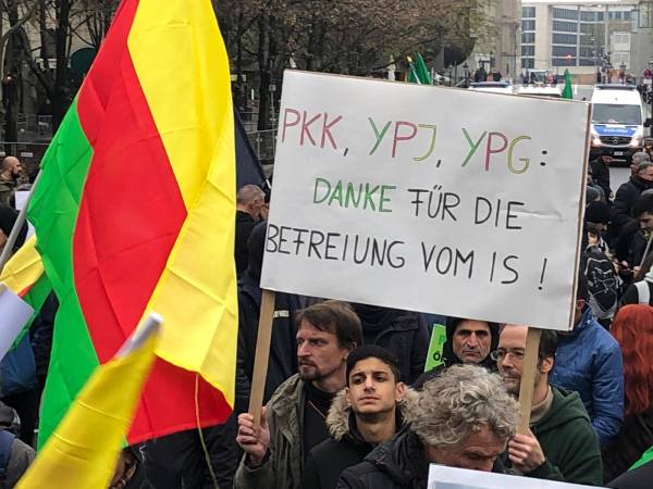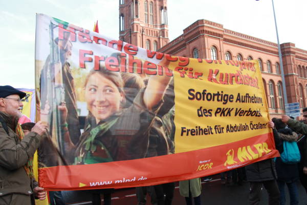 Marchando frente al Ayuntamiento de Berlín, activistas que caminaban detrás de la pancarta "El PKK pertenece a Alemania" (el titular de Taz en 2014), coreaban consignas y portaban pancartas en las que reivindicaban al PKK como "anticapitalista" y "movimiento de mujeres".