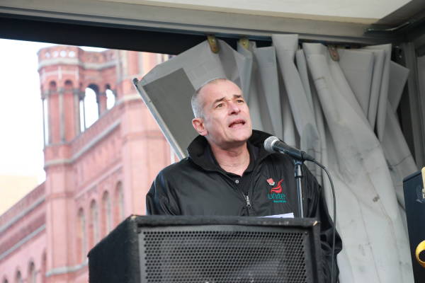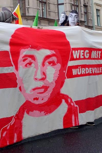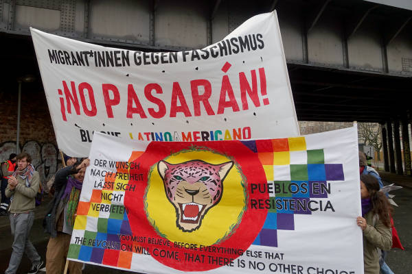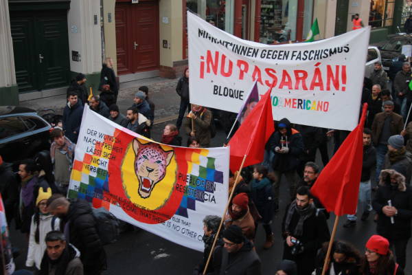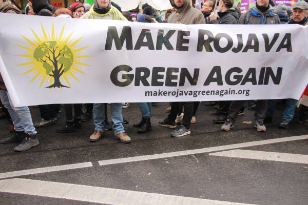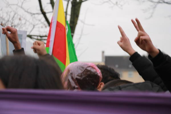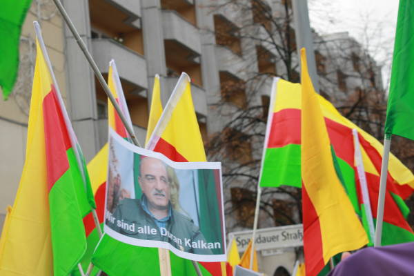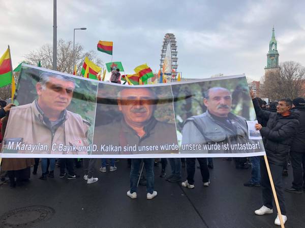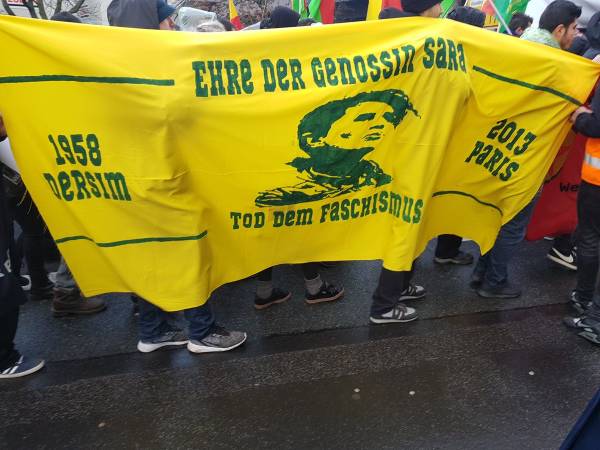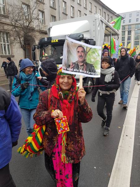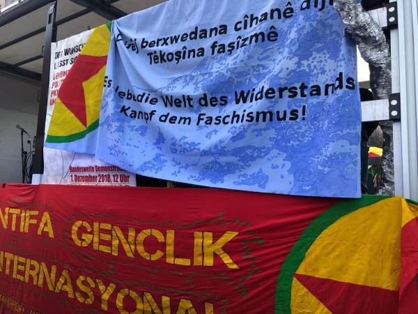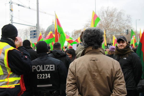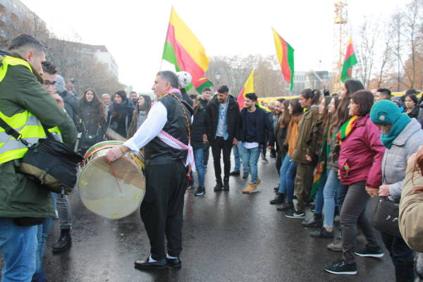 El pueblo alemán garantizó una fuerte participación en la marcha en solidaridad con el pueblo kurdo y su lucha contra la prohibición del PKK (Partido de los Trabajadores del Kurdistán) por parte del Estado alemán, que está en vigor desde el 26 de noviembre de 1993. Los manifestantes exigieron el fin de la política de criminalización de Alemania contra los activistas kurdos y los círculos de izquierda y democráticos. Los discursos pronunciados antes de la marcha condenaron la política cada vez más derechista del Estado alemán y su cooperación con el Estado turco. La multitud también colocó pancartas que decían "Viva la lucha contra el fascismo" y "Viva la solidaridad internacional" en la plaza.