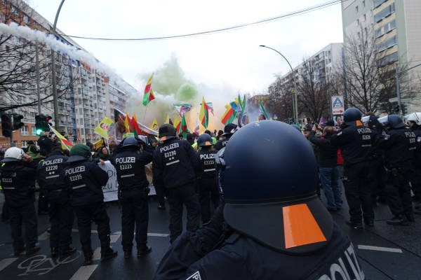 La policía interrumpió a menudo la marcha cuando los manifestantes corearon "Bijî Serok Apo" (Viva el presidente Öcalan), una consigna prohibida por el Estado berlinés en los últimos años. La policía advirtió a la multitud que la marcha no sería permitida mientras se siguiera cantando el eslogan en cuestión.