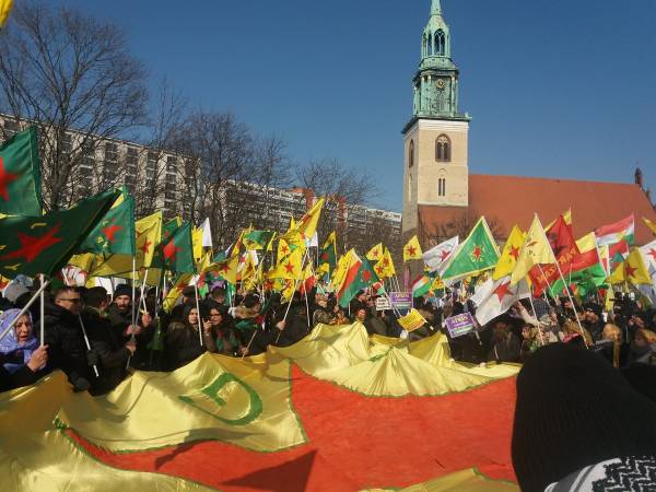 Pidiendo al gobierno de Merkel que "Detenga la complicidad con el régimen de Erdogan", los manifestantes gritan "finanzas alemanas, bombas de Turquía" y "Erdogan fascista". Casi todos los participantes de la movilización sostienen una pancarta de YPG / YPJ, las fuerzas de defensa de Rojava y el norte de Siria.