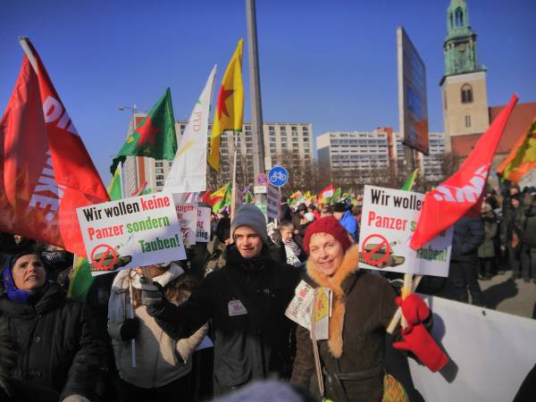 Los medios alemanes e internacionales muestran gran interés en la manifestación que se celebra con el lema "Puente de la Paz y la Democracia de Berlín a Afrin". Los activistas tienen modelos de tanques Leopard alemanes, con los que Turquía ataca a Afrin, para mostrar la complicidad del gobierno federal en los ataques genocidas de Turquía contra Afrin.