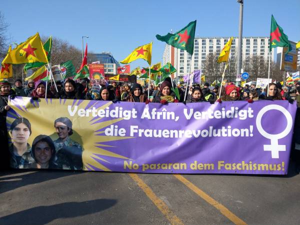 Los lemas cantados por los manifestantes incluyen "panzers alemanes fuera de Afrin" y "Bijî berxwedana Efrînê" (Larga Vida a la resistencia en Afrin). La marcha está encabezada por mujeres kurdas y alemanas que cantan "Jin, jiyan, azadî" (Mujer, Vida, Libertad) y portan imágenes de luchadores de YPJ que fueron martirizados durante la resistencia en Afrin, y de las mujeres y niños masacrados por el Estado turco en el cantón.