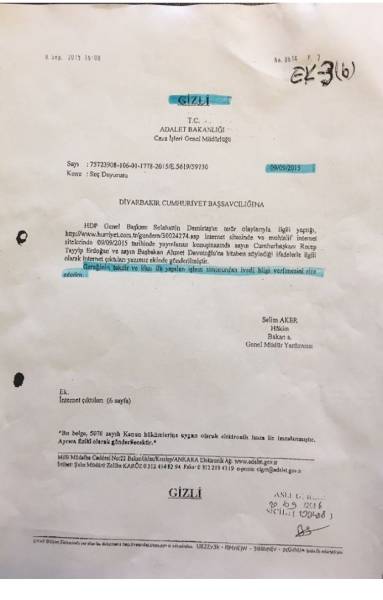 "El Copresidente de HDP Demirtaş celebró una conferencia de prensa en Diyarbakır el 6 de septiembre de 2015 y sus comentarios fueron ampliamente cubiertos por los medios de comunicación. El Ministerio de Justicia tomará acción el mismo día. La Dirección General de Asuntos Penales del Ministerio envía una instrucción a la Fiscalía de Diyarbakır, junto con un expediente que consta de las declaraciones de prensa de Demirtaş adjuntas. En la instrucción, la Dirección General de Asuntos Penales dice: 'Le pido que tome las medidas necesarias, y dé información a nuestro lado después de la acción'. Este es un documento secreto enviado por el Director General del Ministerio de Justicia de Asuntos Penales al Fiscal General de Diyarbakır, en nombre del Ministro de Justicia. El fiscal prepara un resumen de los procedimientos contra Demirtaş el mismo día, en cuanto recibe la instrucción ".