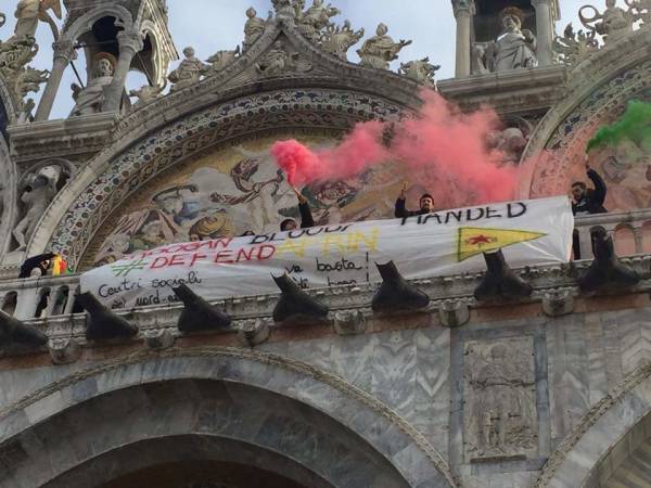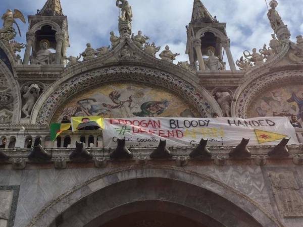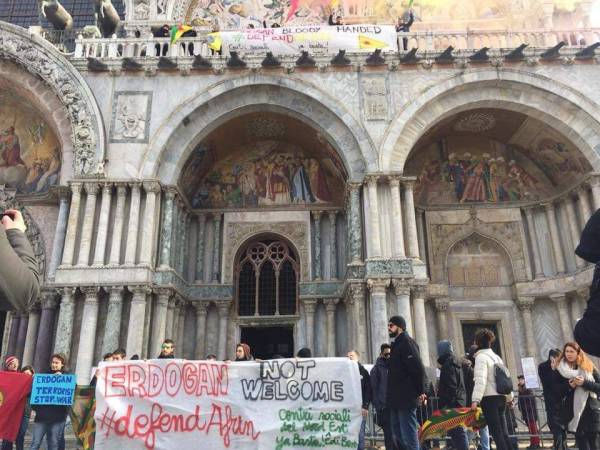 Por otro lado, la organización y los centros sociales Ya Basta (Edi Bese) también protestaron hoy contra Erdogan en la Basílica de San Marcos en Venecia. Los oradores protestaron contra el Vaticano por darle la bienvenida a Erdogan.