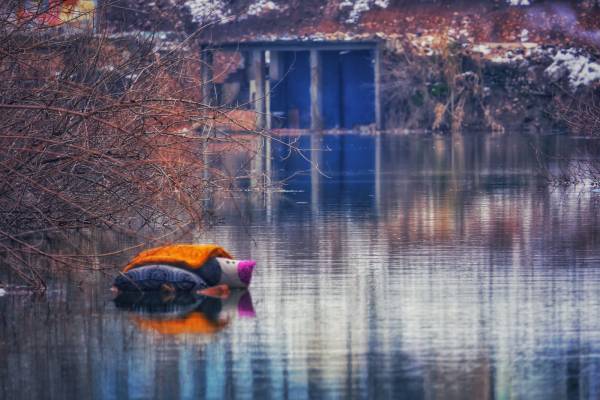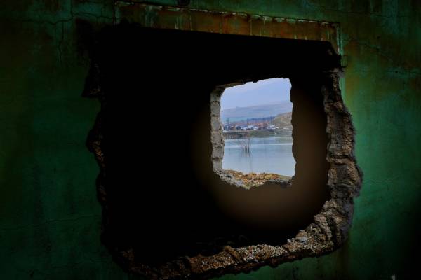 Pronto no quedará nada de la antigua ciudad y el aliento de la historia se ahogará en las inundaciones. A lo lejos vemos una manta o una almohada flotando en el agua. Se ha atascado en un árbol. En la orilla de la presa en ascenso hay una anciana apoyada en su bastón. Algunas personas se detienen y observan la catástrofe, otras toman fotos. El silencio se rompe a veces por la maquinaria de construcción y a veces por el cacareo de los patos.